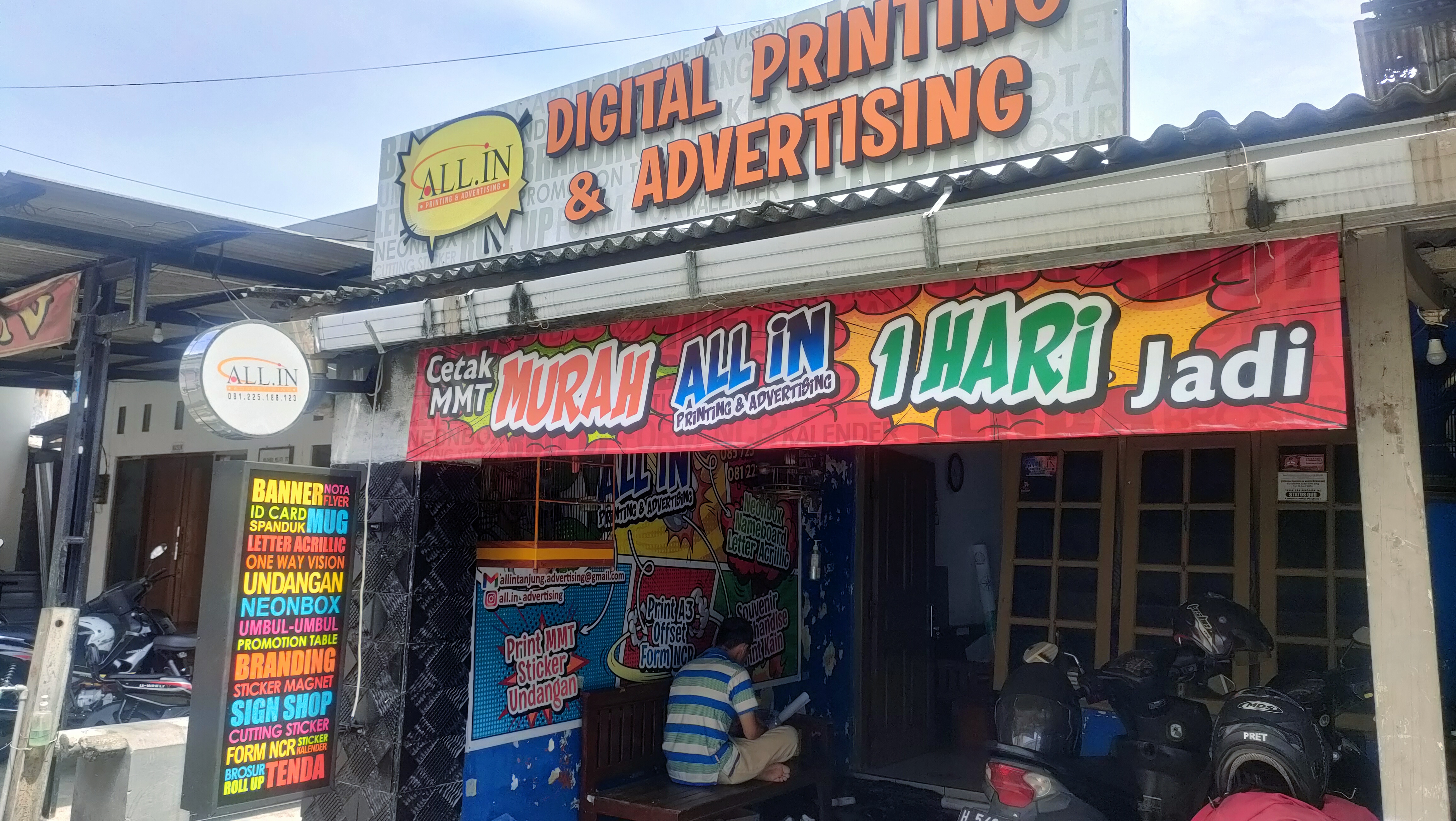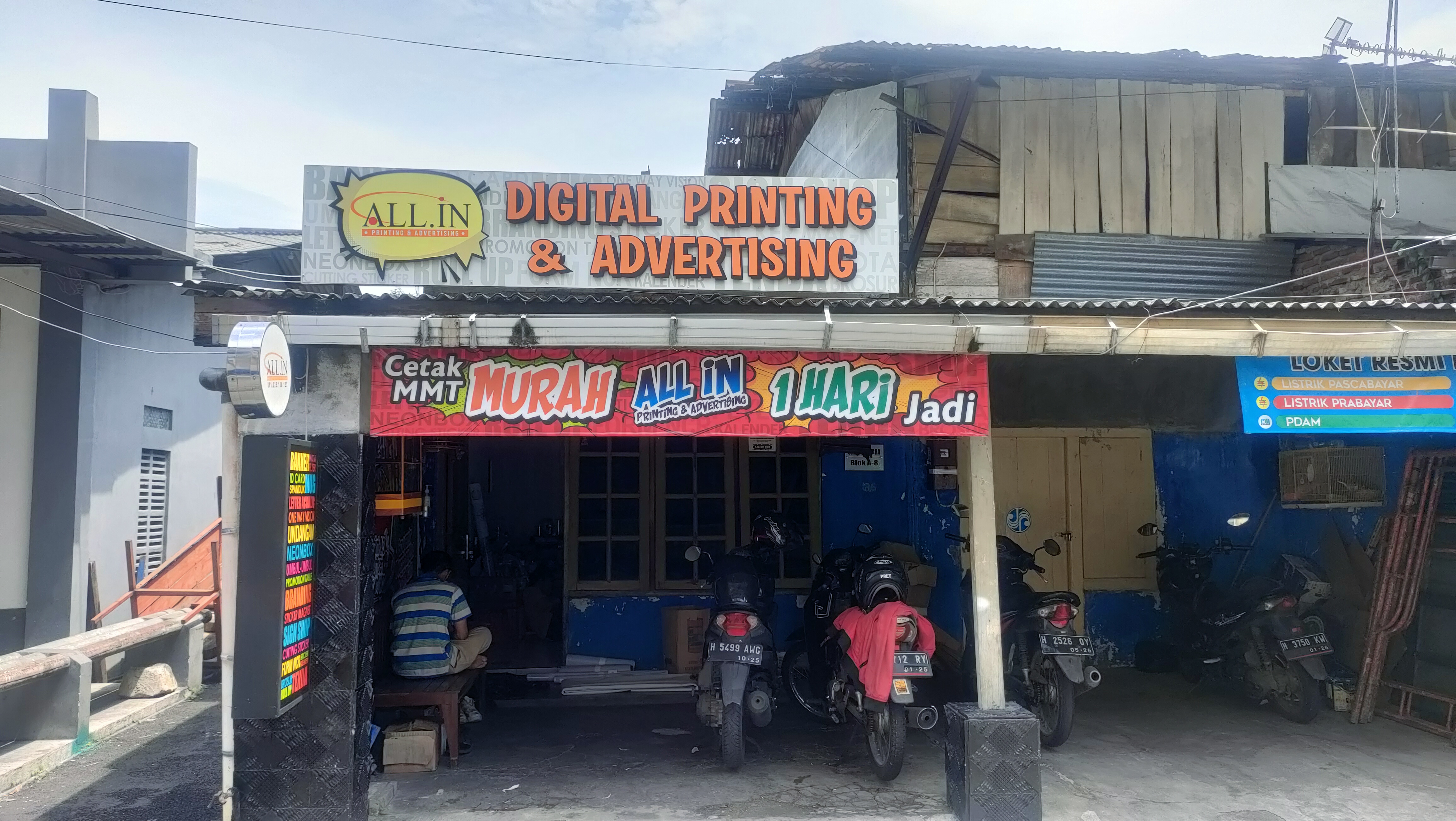 All.in Printing and Advertising adalah perusahaan yang bergerak dalam bidang jasa cetak. Media Promosi yang selama ini dipakai oleh All.In Printing dan Advertising diantaranya dengan surat penawaran, MMT, Instagram dan Whatsapp. Adapun keunggulan dari perusahaan ini diantaranya adalah harga murah dibawah harga pasaran, proses cetak cepat, bebas biaya desain dan pengiriman dalam kota tanpa biaya tambahan. Tujuan utama didirikannya sebuah unit percetakan adalah untuk memenuhi seluruh kebutuhan cetak yang ada di lingkungan perkantoran sekitaran kami. Namun dalam perkembangannya percetakan dituntut untuk bisa mengerjakan semua jenis cetakan dan alat promosi, seperti kebutuhan cetak dan promosi di lingkungan instansi, sekolah, serta masyarakat luas pada umumnya. Mulai dari cetak brosur, poster, flyer, kalender, buku, jurnal, majalah, tabloid, paper bag, goodie bag, undangan, souvenir pernikahan, MMT, spanduk, baliho, umbul-umbul, backdrop, reklame, neon box, letter timbul, sticker, branding mobil, kaos, jaket dan lain-lain. All.in Printing and Advertising juga memiliki SDM yang unggul, profesional, dan berpengalaman di bidang percetakan, serta ditunjang oleh fasilitas mesin-mesin modern yang mampu bersaing dalam dunia percetakan.